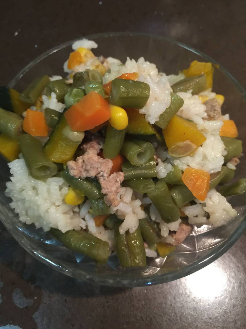 大米适量;豆角适量;葱姜蒜适量;老抽适量;鸡精适量;盐适量;肉馅适量;南瓜适量;胡萝卜适量;玉米粒适量;