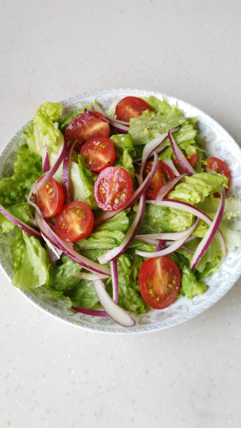 2:生菜洗干净撕成小块,小西红柿对半切开,放入一个大碗里。