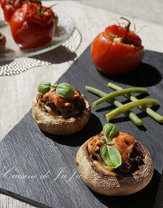 5:把肉末酱放进蘑菇里,juju同时也做了几个番茄盅