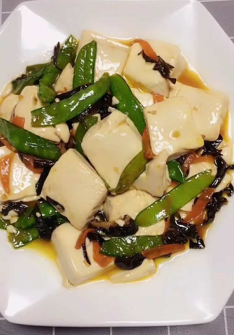 3:炒熟加入水淀粉勾芡,倒入豆腐翻均匀(不要用勺子翻,内酯豆腐容易碎),罗汉豆腐就完成啦。