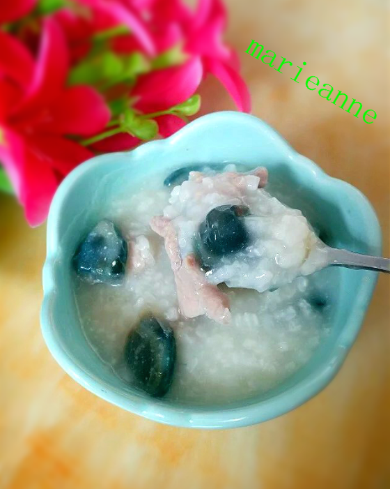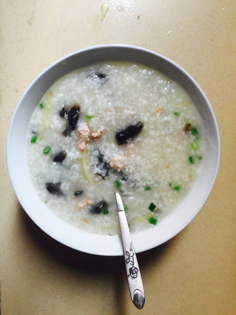 2:煮粥我就不用跟大家细讲了吧清水大米煮开后加入木耳丁以及一半的皮蛋小火煮至粘稠后加入剩下的一半皮蛋和香葱末搅拌均匀关火盛盘