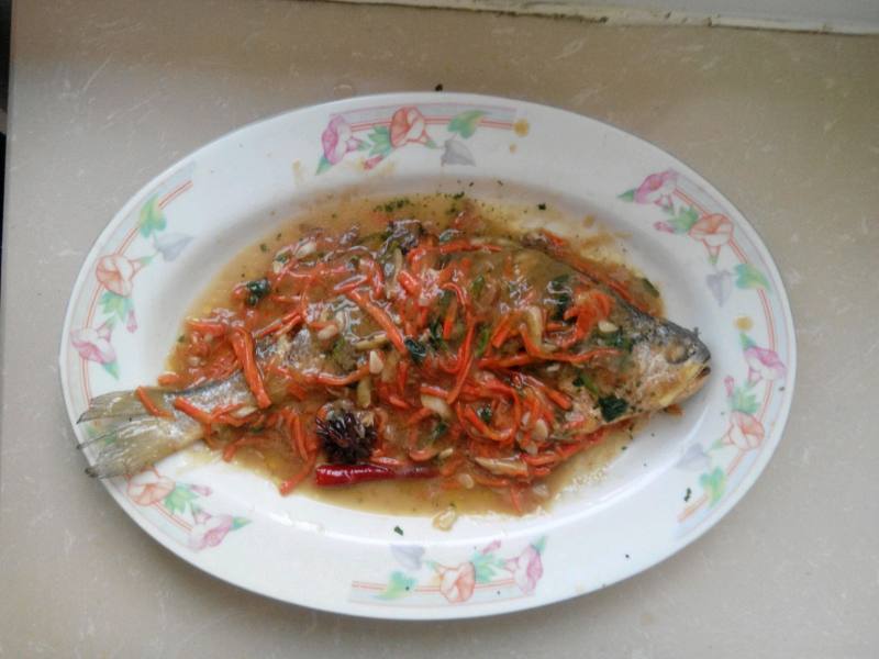 9:锅内汤汁减少,剩余做芡汁的量时,将鱼盛出放入盘内。