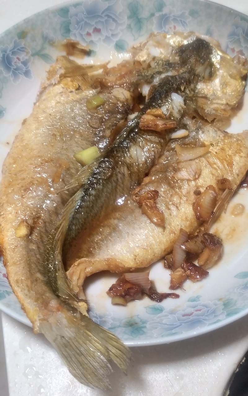 5:放入蒜头一起煎,后把鱼捞出,油和蒜留着继续,
