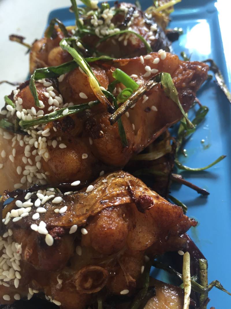 4:葱段垫铺鱼下,煎至鱼四面金黄捞出裹酱油在下锅放到葱上继续煎,鱼表皮酥脆捞起装盘即可!