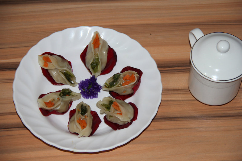 6:然后包完之后在饺子的两个窝内分别放入碎胡萝卜粒和香菜粒。然后烧一锅开水开始蒸制半小时左右。就可以吃了!最后自己可以调制一些酱汁,可以用海鲜酱辣椒油加一点醋,调成汁!