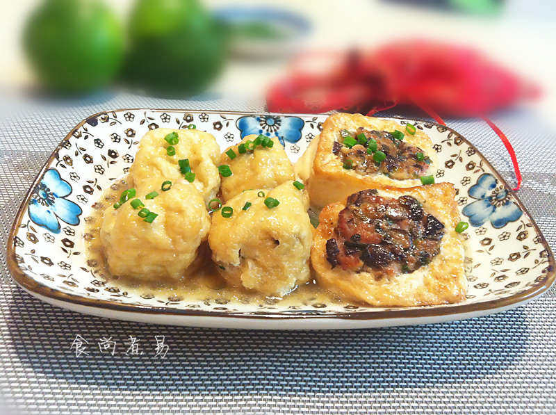豆腐泡比较吸水,焖煮时可以适量添加多一点汤汁。嫩豆腐两面煎一下可以保持完整。馅料可以按各人喜好而随意变化。