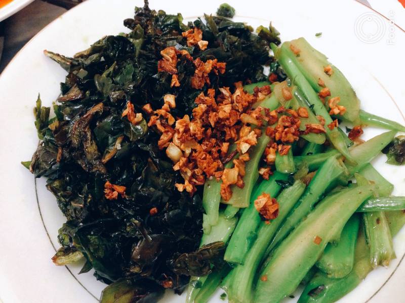 3:将炸好的芥兰叶和炒好的蒜香芥兰上碟即可享用。