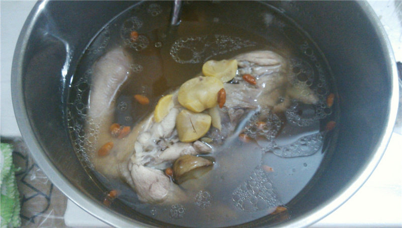 4:鸡腿和生姜料酒煮半个小时后,放入枸杞,板栗和百合,再煮十五分钟