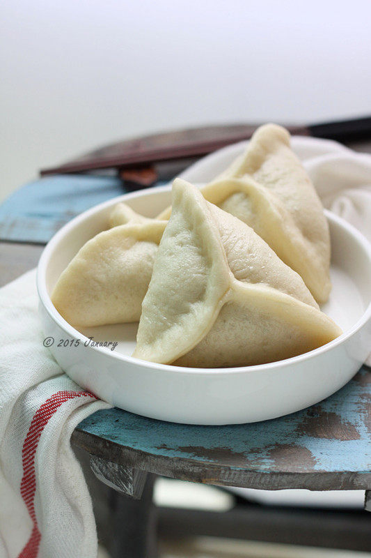 10:每夹好一个糖三角就码放在铺了湿屉布的蒸锅里,全部放入后盖盖子饧20分钟左右,生坯是原来的1.5-2倍大小并且明显圆润了,开大火,上汽后蒸15分钟,焖5分钟再出锅,表皮不皱不缩。