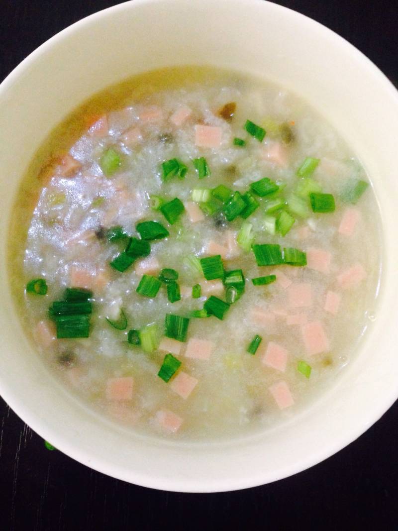 3:把泡米的水直接熬,熬开后五分钟放鸡肉,小白菜,皮蛋,火腿熬开后小火继续熬。熬粘稠后放盐,滴两三滴香油,葱,关火,好吃的粥就好了。