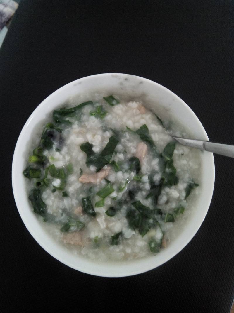 5:好了,准备材料的时间周基本煮号了。(用剩饭煮粥的时间会更快的。)先把腌好的猪肉下下去,那筷子慢慢的搅拌一下。等重新开始咕嘟咕嘟冒泡泡的时候在下皮蛋丁。等再次冒泡泡的时候在下准备好的雪寒菜(雪寒菜煮稀饭在蜀很久了)然后视粥的咸淡调入适量食盐。撒上香葱花,就可以上桌了,给父母老婆孩子冬日早饭的温暖!