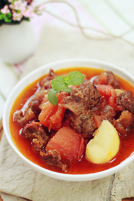 9:最后将番茄和土豆块一起倒入已经焖煮一个小时的牛腩锅里,继续再煮约一个小时,用盐调味,即可!