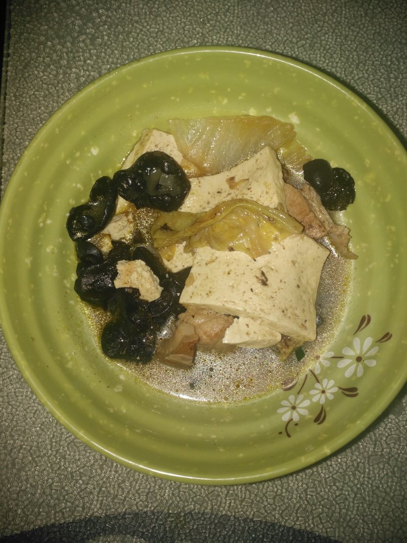 1:准备食材:五花肉300克,泡发木耳100克,老豆腐500克,白菜叶(忘了放入)。