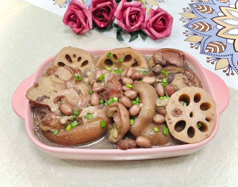 如果你喜欢软烂的花生也可以一开始就加入,花生米煮过之后可以去掉浮沫,不会影响猪蹄的卖相。