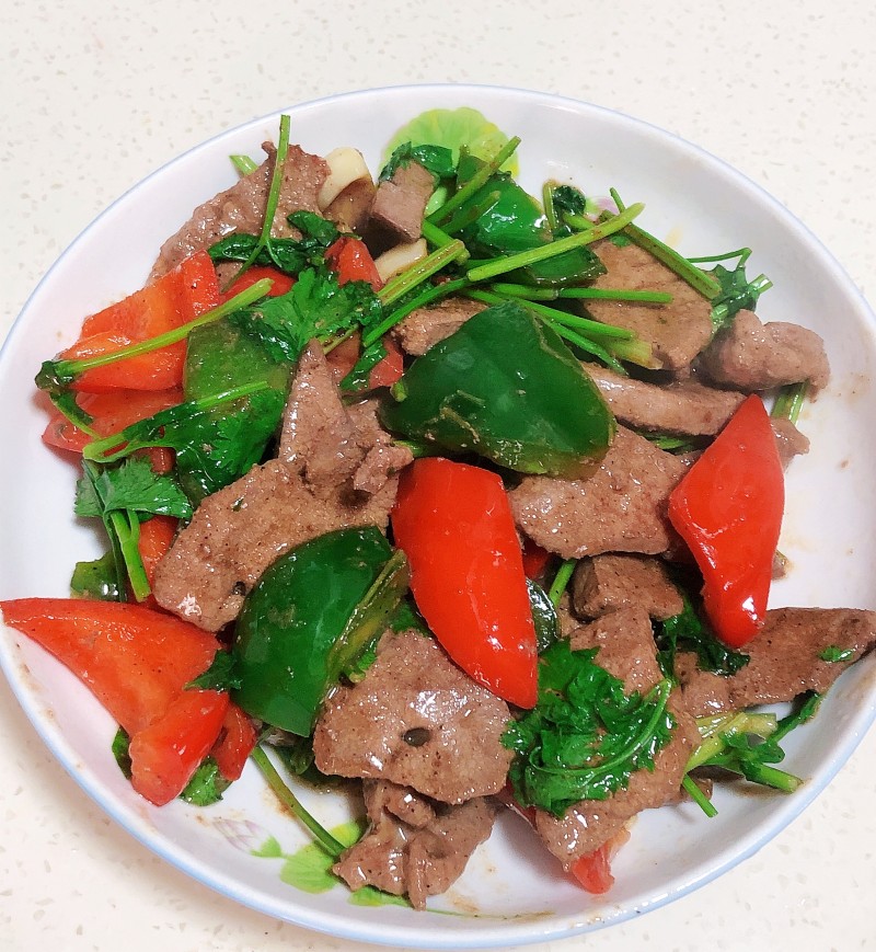 4:大火爆炒腌好的猪肝,炒至变色九分熟后加入灯笼椒一起翻炒片刻,出锅前加入香菜即可。