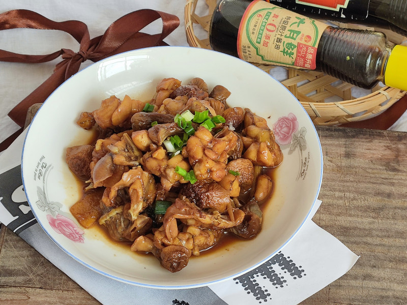 5:下牛蛙块翻炒,下1勺味达美臻品料酒、2勺六月鲜特级原汁酱油、1勺六月鲜红烧酱油炒匀。