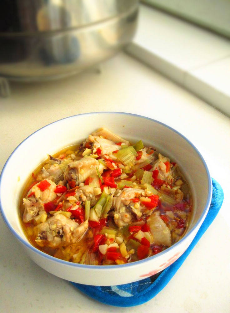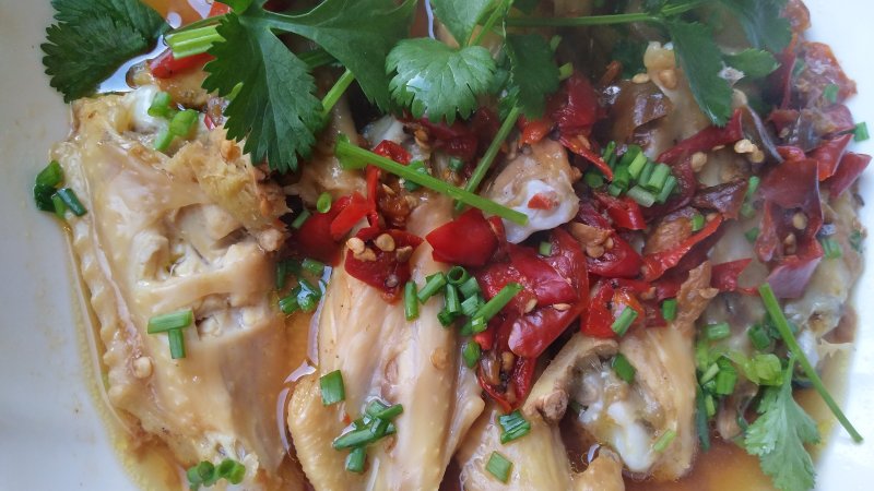 7:在蒸好的鸡翅上撒少许葱花,趁热浇上花椒油。