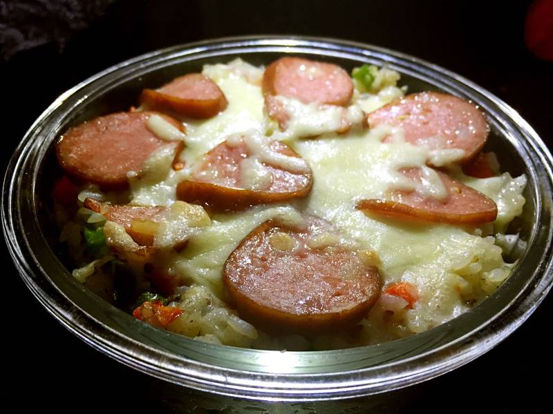 4:米饭上铺一层马苏里拉奶酪,哈尔滨红肠切片均匀放在奶酪上,在撒一层奶酪