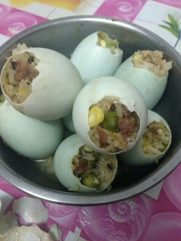 3:把咸鸭蛋敲一个小洞,把蛋清弄出来,放入糯米馅。小洞向上,米放八分,水倒入蛋蛋里好,放在蒸笼里。烧水蒸上十几分钟就可以吃了。