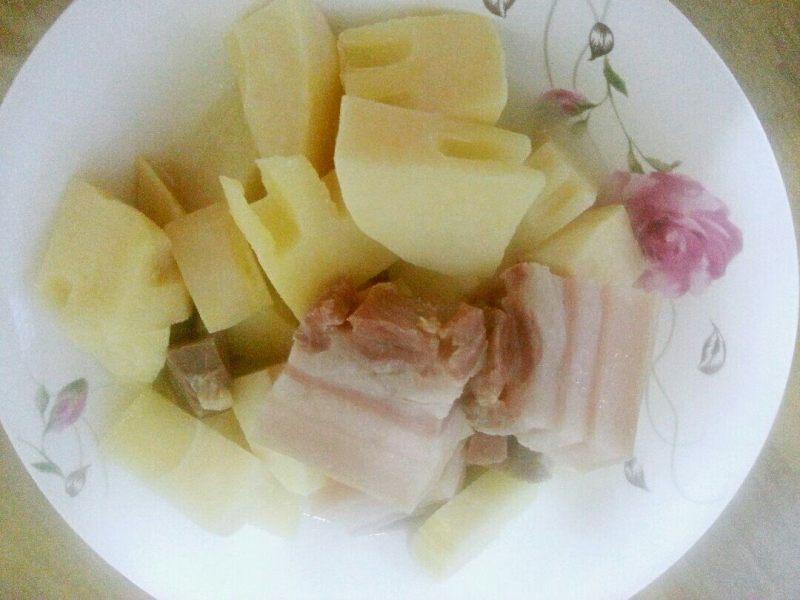 3:五花咸肉切块,焯水加黄酒,去沫,然后换上清水没过咸肉大火煮半个小时,加入笋放适量的开水没过笋大火煮开换中火煮半个小时
