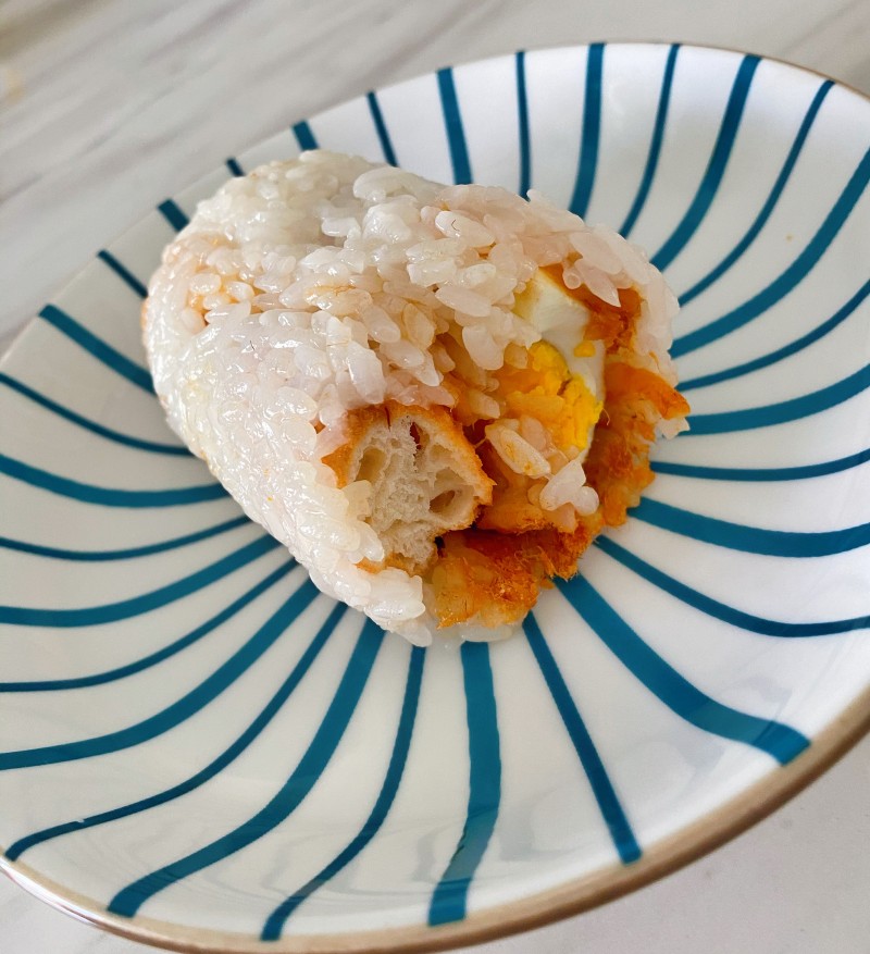 3:把饭团用手压实,把保鲜膜的口收紧,缓一缓,再打开取出饭团