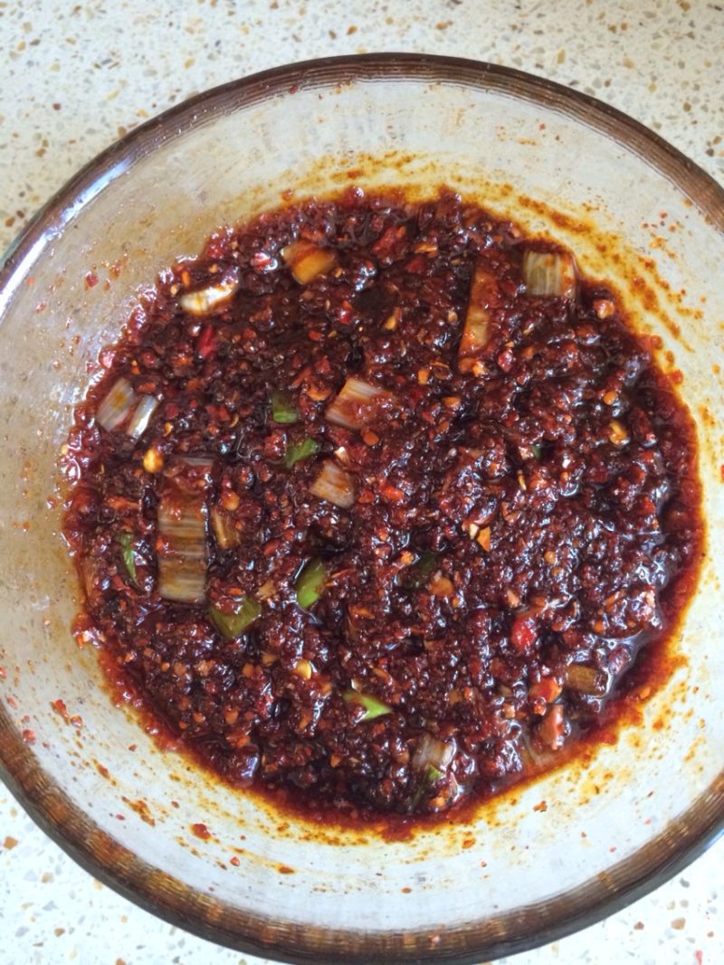 2:取三分之二的辣椒面,放在耐热碗中,葱姜蒜切碎,同芝麻,盐,糖,十三香搅拌均匀。