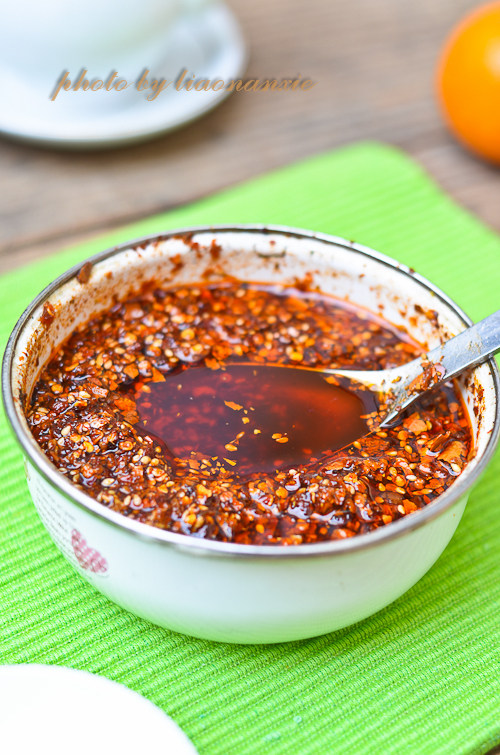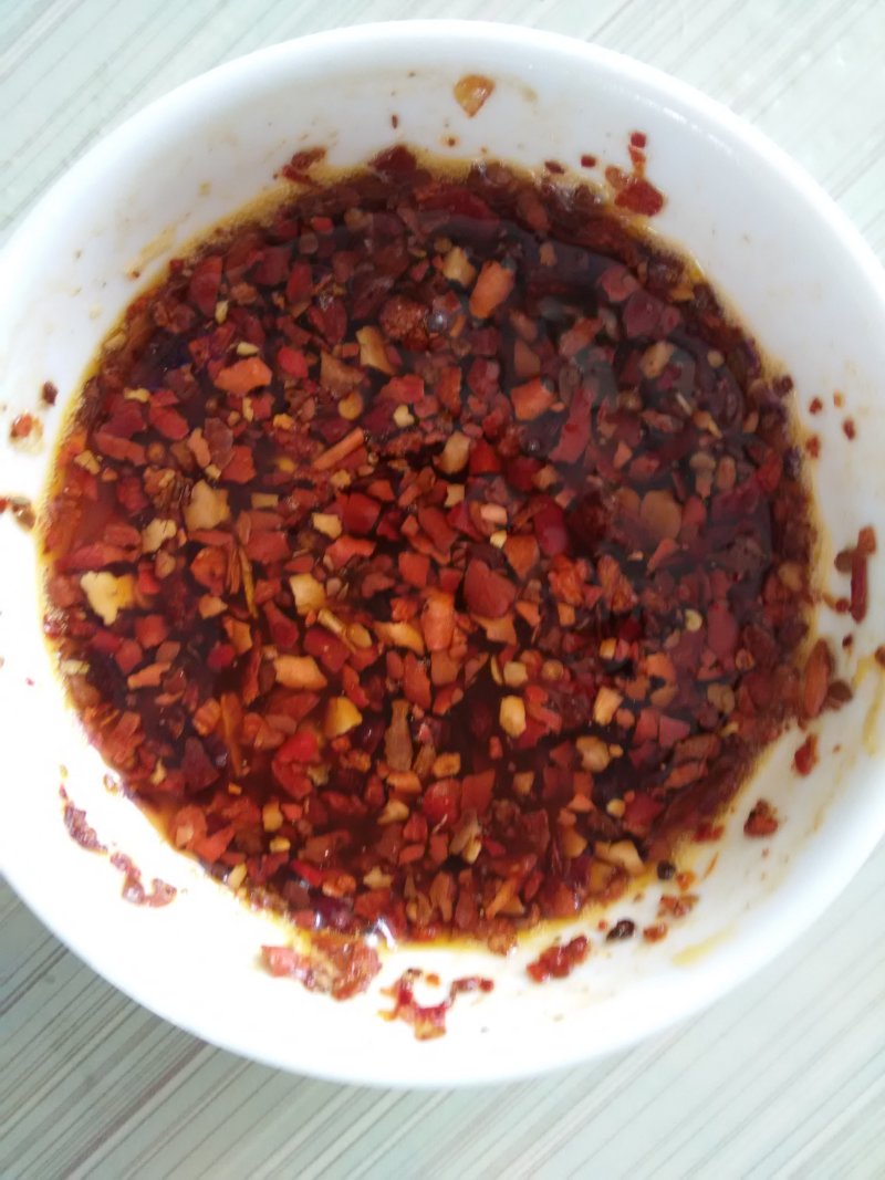 3:将热油缓慢浇,在辣椒碎上边教边调匀即可。