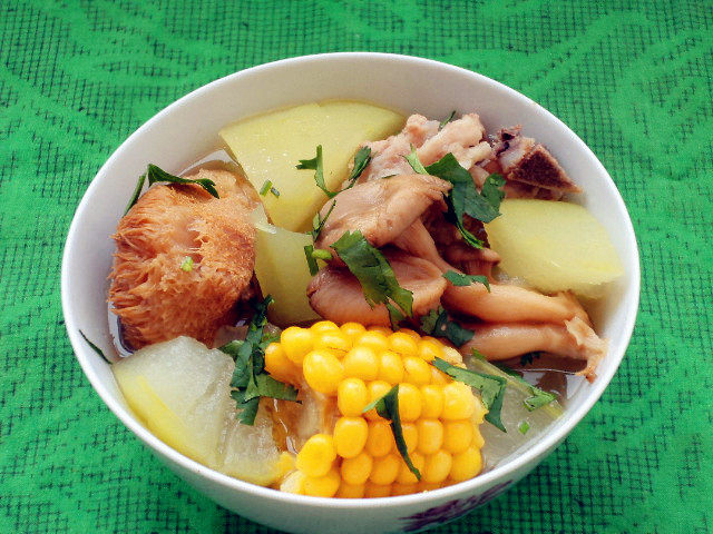 1:将野生菇、玉米在热水锅里焯。