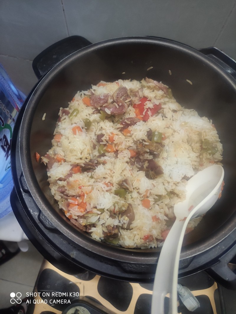 把炒好的菜一定要放到米饭上面,不要拌,一定要米饭蒸好了之后拌。我这次提前拌了,锅底就有一点糊了。