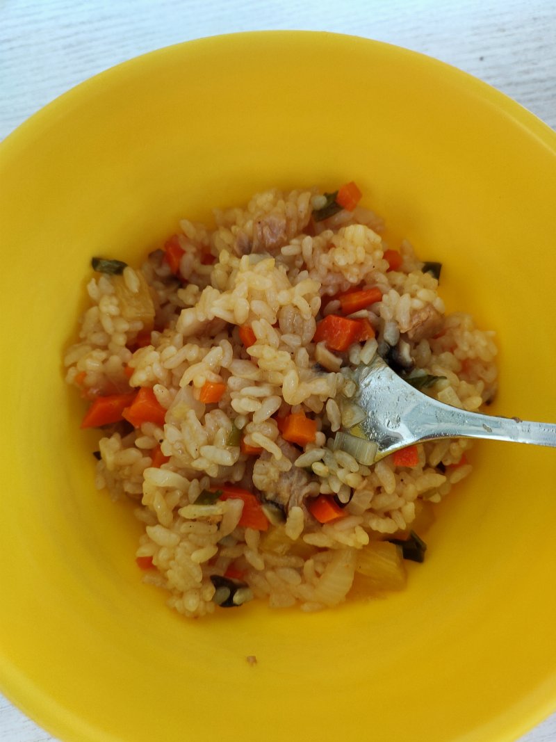 3:把大米和配菜混合加水。