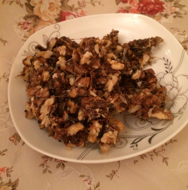 烤熟的核桃仁240克;白糖90克;芝麻1勺;植物油1勺;