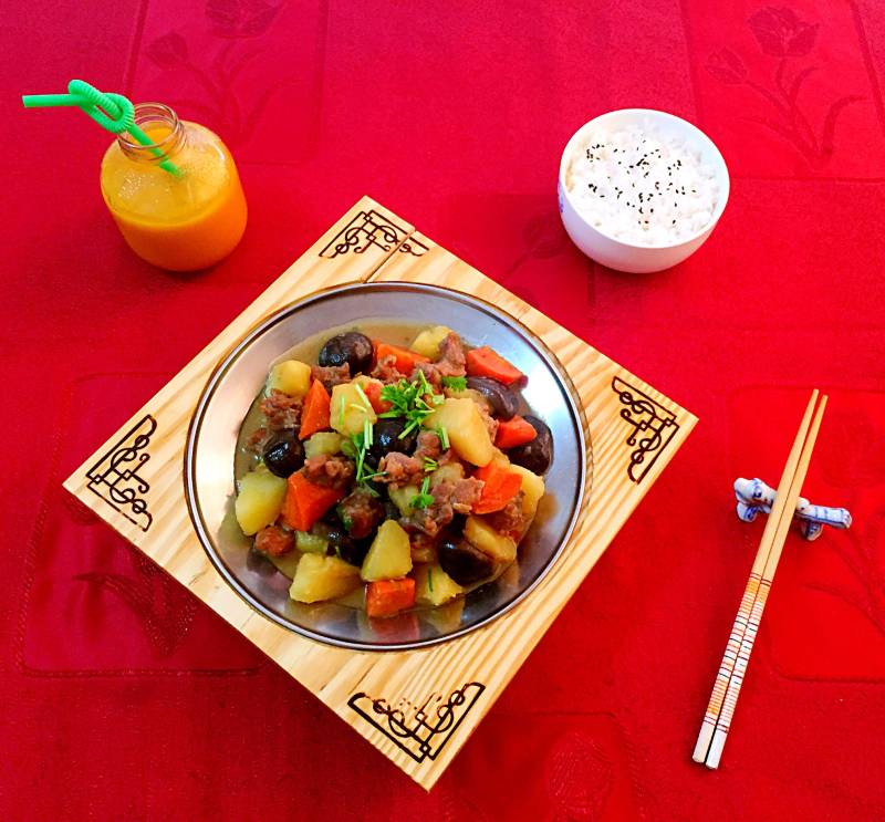 小贴士:除了土豆还可以放一点西兰花、洋葱等别的蔬菜,味道也很美。一定要趁热吃。羊肉的放凉了会变得很硬,难以下咽。