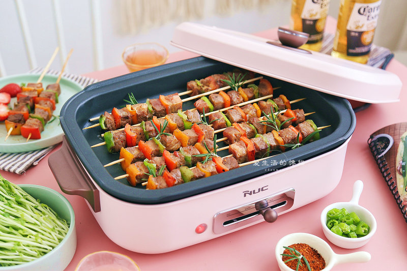 7:热锅,涂上一层薄油,把牛肉串放在裹上,中小火慢煎,我用的NUC锅来煎,要是有烤箱,也可以用烤箱烤,但是记得翻面哦。