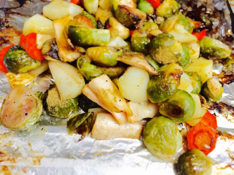1:首先把蔬菜切块切片。我用的是孢子甘蓝,杏鲍菇,土豆,和胡萝卜。