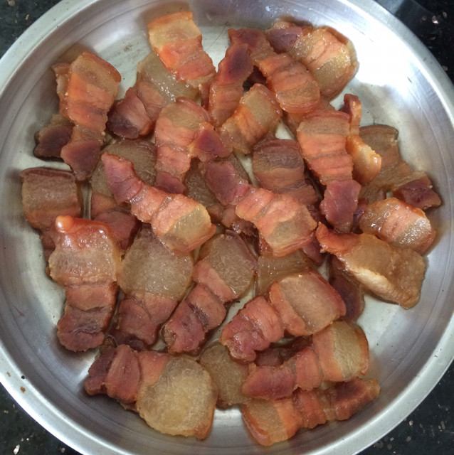 2:腊肉拿出来一定要煮熟,我用了图中的一半腊肉