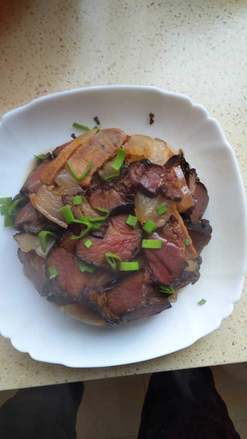 自晒腊肉90g;自制咸菜干40g;大蒜两瓣;生姜两片;