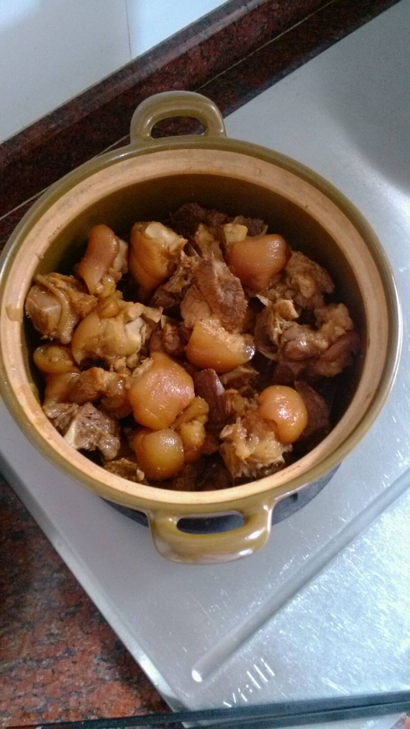 2:猪手过了冷水后,洗干净,直接放到砂锅里,然后把所有的材料(除了豆腐乳)放到砂锅里,焖一个小时!