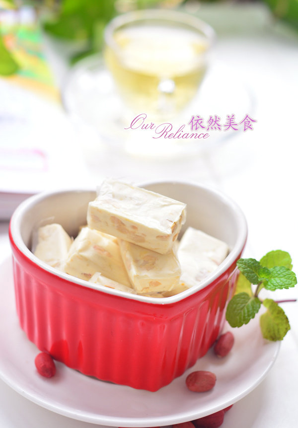 1:材料:细砂糖160克麦芽糖75克蜂蜜135克蛋清35克花生米260克水50克糯米纸适量2.把花生米放入预热好上下火170度的烤箱中层,烘烤8分钟左右,烤出香味且烤到花生红衣微微开裂即可取出备用(或用炒锅小火炒数分钟至炒熟)3.细砂糖水倒入奶锅,用小火加热,使细砂糖完全溶解。4.倒入蜂蜜5.倒入麦芽糖再加热至沸腾并持续用小火熬煮片刻(用筷子搅拌一下)。6.煮糖浆的同时,准备一个无油无水的大盆倒入蛋清。7.将蛋清用打蛋器打发至硬性发泡程度(提起打蛋器,蛋白能拉出直立的尖角)8.将糖浆熬煮到140℃。(如果没有糖浆温度计,准备一碗冰水,用筷子蘸糖浆,滴入冰水里,如果糖浆能形成坚硬的糖珠,就表示熬好了)。一边用打蛋器快速打发蛋白,一边把刚煮好的滚烫的糖浆立刻倒入蛋白里。9.糖浆全部倒入后,继续打发片刻,浓稠顺滑状态。10.倒入第一步准备好的花生,搅拌均匀11.打好的糖浆如图。12.容器内铺入多层糯米纸稍微刮平,然后等待糖冷却变硬。变硬以后,用刀把糖切成小块即可。