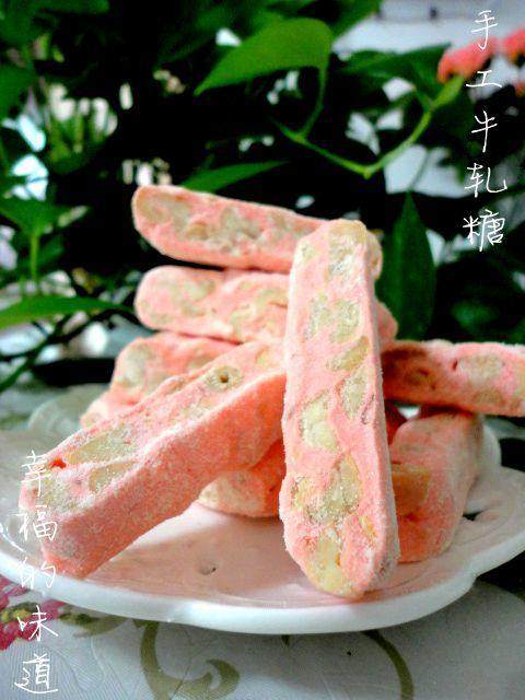 做好的糖浆,最重要的是糖浆的温度。糖浆的温度直接决定了牛轧糖的品质,糖浆没有足够的温度做好的牛轧糖冷却后太软太黏。糖浆如果熬过头会有焦味也会太硬,所以熬糖浆一定要用小火,把糖浆滴入水中能够立马形成小糖珠就表示煮好了,这时立刻将糖浆倒入打发的蛋白里不要用成品的花生米(超市的都是有添加味道哦)最好自己烤或者用炒的这样才是原汁原味的哦,切好的牛轧糖要立刻包起来后者装入容器内密封好,是个容易受潮的糖果哦。