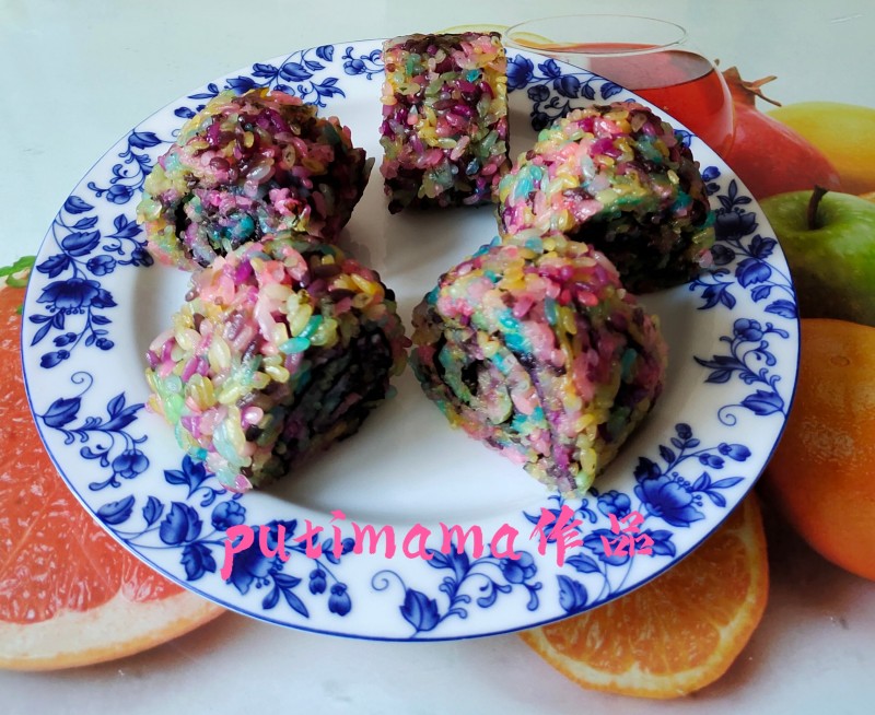 1:云南五彩米洗净做成米饭,我没浸泡因为是彩色糯米,蒸饭的水也较平常大米饭水少些,否则不成型。