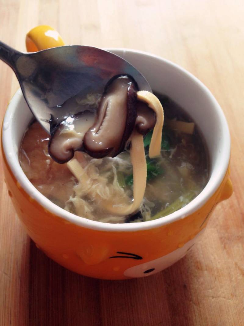 2:汤锅中放入香菇、木耳、百叶、火腿加水,大火烧开,转小火烧5分钟,加两勺醋烧开,转大火倒入水淀粉,搅拌均匀烧开