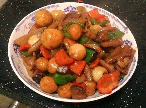 4:锅里放油,爆香姜葱蒜碎,放入鱿鱼,鱼丸,鹌鹑蛋煸炒到听不见水油相遇的霹雳声。