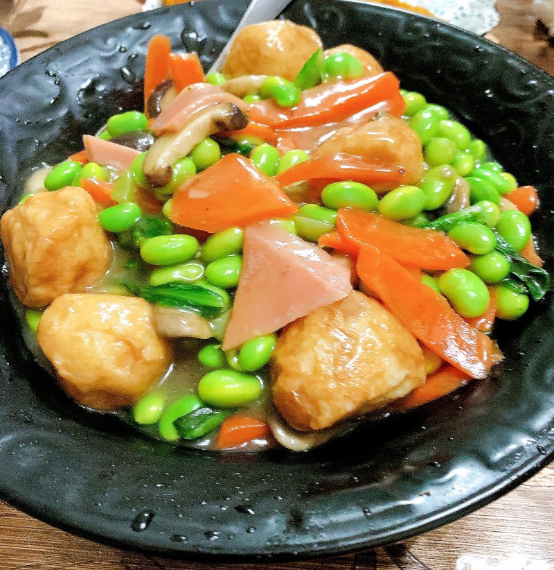 1:百叶、木耳、火腿肠切丝、香菇切片、芹菜去叶切段、鸡蛋捣匀、淀粉加水调开、油面筋掰开