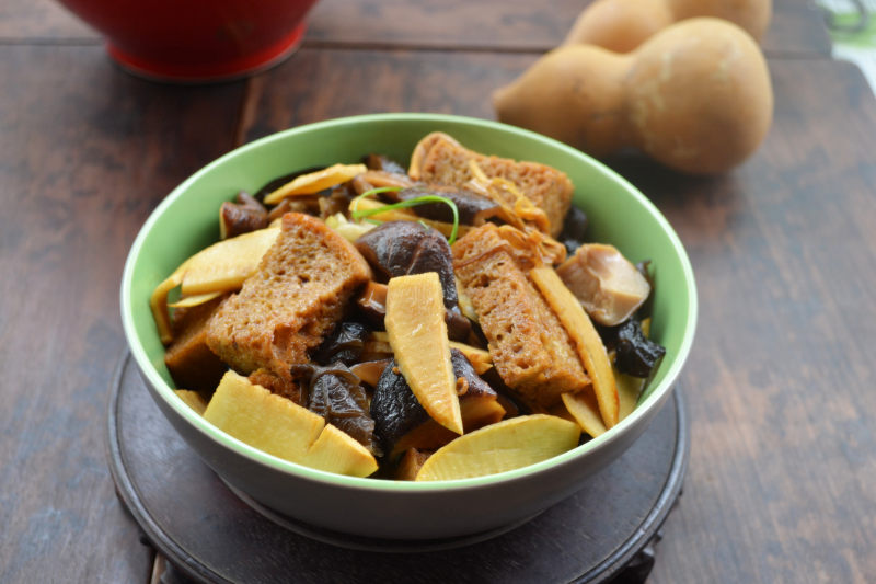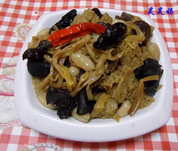 1:四鲜烤麸用到的四鲜:黄花菜,黑木耳,干香菇,玉兰片,都是用的干品,提前用水泡发。