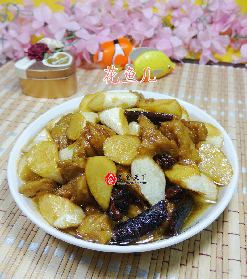 5:再热油,放入姜,烤麸翻炒至少许焦黄。