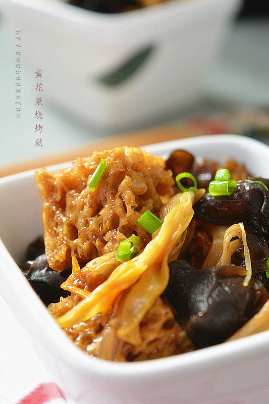 烤麸2块;木耳适量;黄花菜适量;香菇适量;