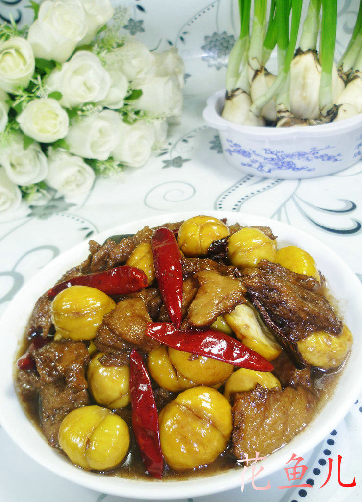 5:随后,搁入干辣椒、桂皮和大料,合入板栗肉翻炒一下。