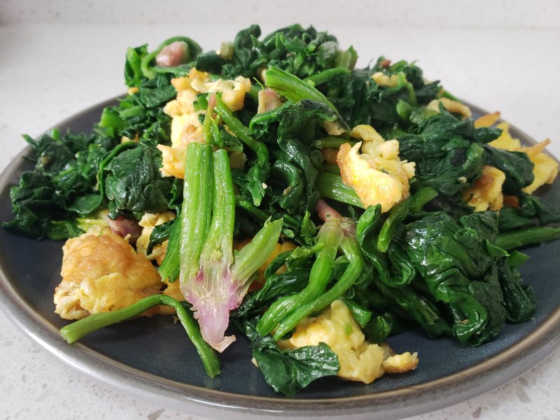 8:锅烧热放适量水,倒入蛋液,翻炒一下,用铲子捣块,再倒入菠菜加盐调味,翻炒几下即可。