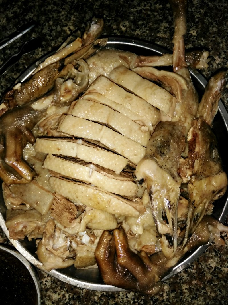 3:准备大锅,倒入足够的水,大火烧开,放入鹅,水要浸过鹅,加入少量盐,米酒,花肉(要有点鹅才更香淳),芫茜、葱。水再次烧开后转中火,保持水温要开不开状97度左右,浸40~50分钟(视乎鹅的大小)就熟了。中途每隔10分钟把鹅捞起倒出鹅肚的水(目的均匀受热)并变换方向(上下)。