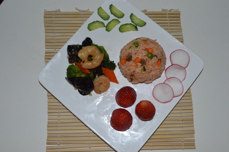 5:配上西兰花炒木耳,来点水果,开饭哦……